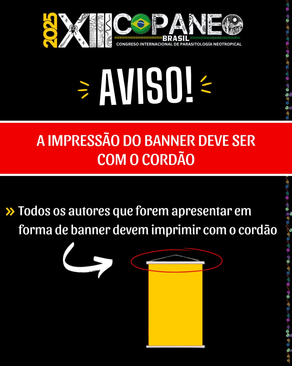 Modalidad presencial: En caso de presentación en modalidad presencial, es necesario llevar el póster impreso en las medidas solicitadas (90 cm de ancho por 120 cm de alto) con el material que sea de su agrado y con un cordón que permita su soporte.